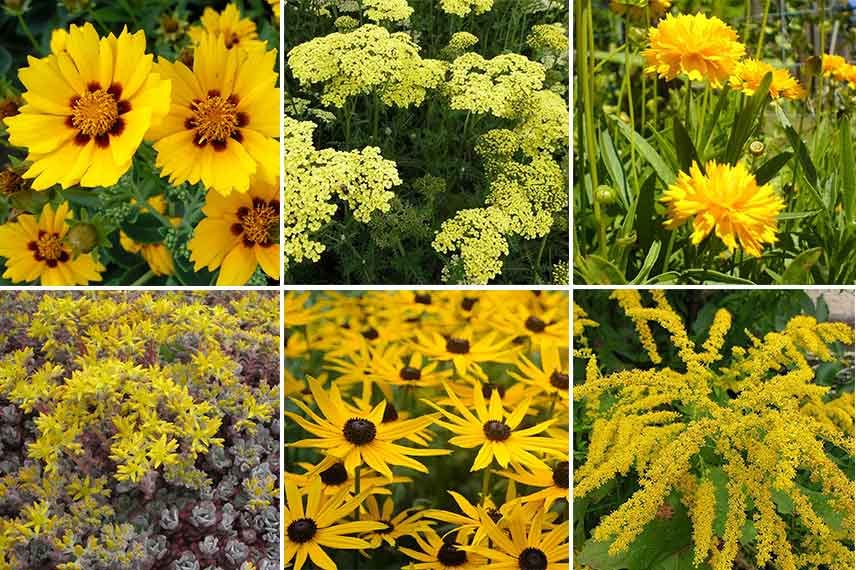 Coreopsis grandiflora ‘Sonnenkind’, Achillee ‘Credo’, Coreopsis grandiflora ‘Louis d’Or’, Sedum spathulifolium ‘Purpureum’, Rudbeckia fulgida ‘Forever Gold’ et le Solidago ‘Gold King’ (de gauche à droite et de haut en bas)