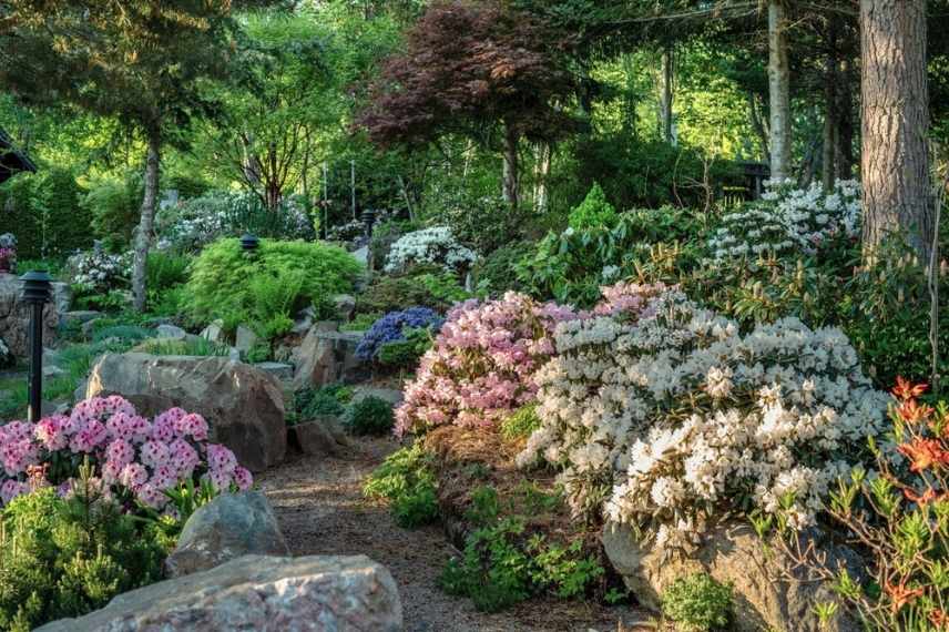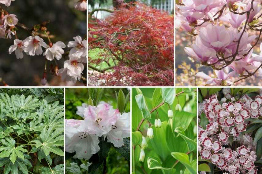 Les floraisons blanches délicates s’immiscent parfaitement dans un jardin japonisant, elles y apportent leur extrême délicatesse : azalées et rhododendrons, Pieris, Magnolias stellata, mais aussi des vivaces comme le Sceau de salomon… On les choisit blanches à crème, avec de subtiles nuances de rose comme le Rhododendron edgeworthii et le Pieris polifolia ‘Blue Ice’. Ici encore, un ou deux arbustes rosés viendront soutenir l’ensemble comme un Prunus incisa ‘Mikinori’. Des feuillages panachés de crème comme le Cornus controversa ou une silhouette tabulaire comme un Viburnum plicatum, les feuilles pourpres d’érables du Japon, des conifères taillés en nuage, et les graminées japonaises couvre sol (Ophiopogons noirs et Hakonechloas dorés) seront d’indispensables compagnons.