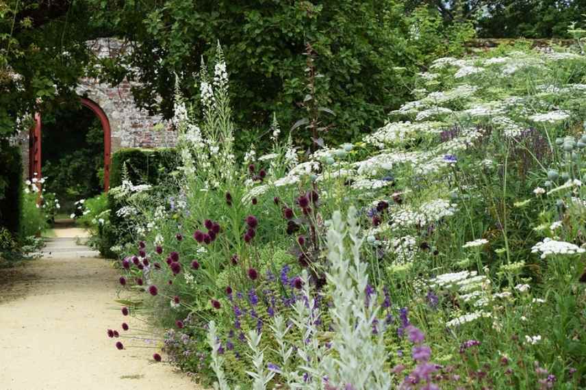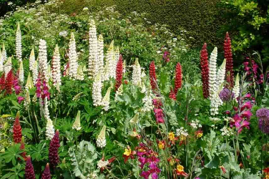 Un massif généreux de lupins de Russel blancs et pourpres, d’Alliums, d’Ancolies et de gladolius communis (© Phil Bartle)