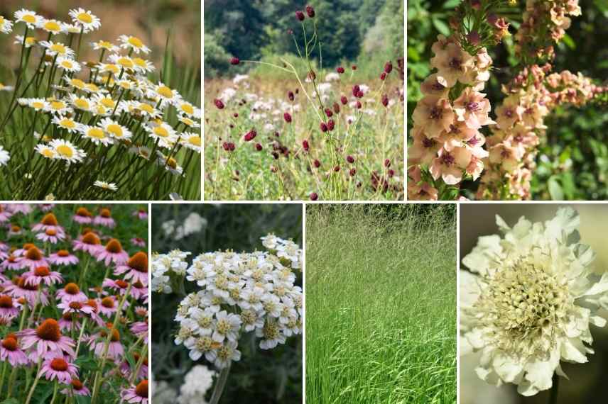Leucanthemums, Sanguisorbas , Verbascum, Echinacées pourpres, Achillées, Molinie et Cephalaria.