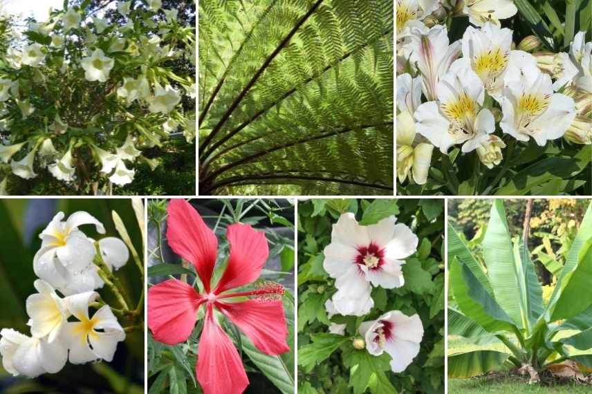 Brugmansia, Cythaea, Alstroemeria ‘Garden Summer Sky’, frangipanier, Hibiscus coccineus, Hibiscus syriacus et bananier