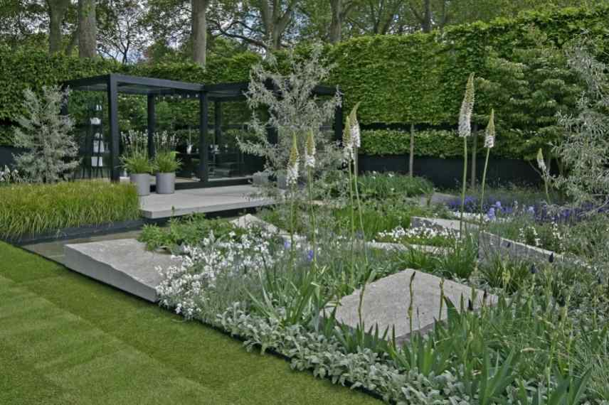 Un jardin anglais jouant ici uniquement sur les tonalités blanches, grisées et mauves (© Mark)