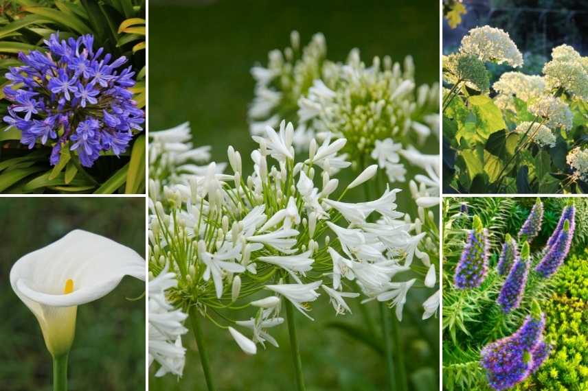 Agapanthes bleues et blanches, Arum, Hydrangeas ‘Annabelle’ et Vipérine des Canaries