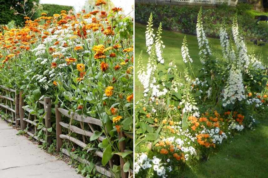 A gauche, une tâche blanche soulage la masse orangée des soucis, A droite une proportion plus importante de fleurs blanches apportées par les digitales et pensées : seules quelques giroflées ponctuent agréablement l’ensemble © Gwenaëlle David