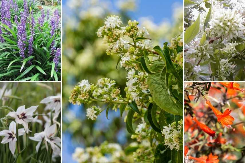 Liriope muscari ‘Majestic’, Gladiolus callianthus, Heptacodium miconoides, Abelia chinensis, et ll’orangé Epilobium canum