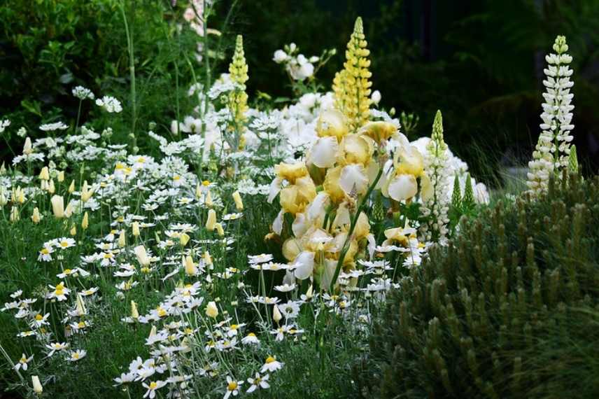 Un décor très doux de Leucanthemums blancs, de lupins et d’Iris, ponctués du vert d’un pinus mugo (© Mark)