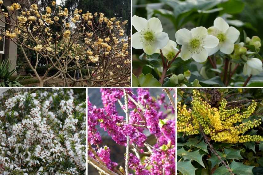 Edgeworthia chrysantha aux fleurs blanches et jaunes, Hellebore ‘Candy Love’, Bruyère blanche (Erica carnea’Springwood White’), Daphne mezerum et Mahonia