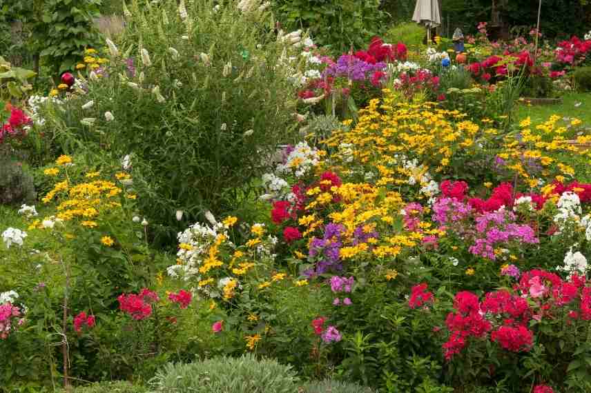 Une belle scène estivale aux tons chauds jaune, rose et mauve, éclaircie par la blancheur d’un Buddleia et de Phlox blancs
