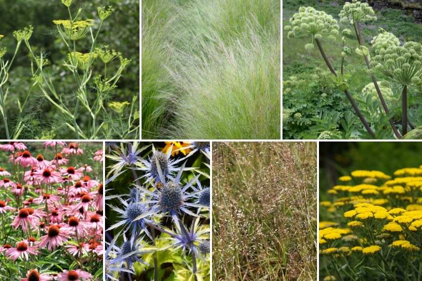Le fenouil est associé dans ce massif natualiste à quelques Stipas tenuissima, des Angéliques archangelica, des Echinacées pourpre, des Eryngiums planum ‘Neptune’s Gold’, des Sporobulus heterolepsis et des Achillées