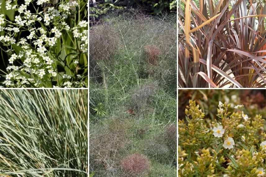 Dans cette configuration, un fenouil bronze ou un Foeniculum ‘Giant Bronze’ seront superbe avec leurs notes pourpres très natures, que vous associerez à une palette de tons gris et de floraisons jaunes, blanches et bleues. Optez bien sûr pour des plantes frugales et d’allure sobre mais chic, et de hauteurs variées comme l’Helichrysum orientale, l’Euphorbia corolatta, la lavande angustifolia ‘Munstead’, le Ciste monspeliensis, les Asters frikartii, les Calaminthas. Quelques Helictotrichons pourront s’immiscer en apportant une note bleutée et puisque votre terrain sera bien drainé, vous pourrez même implanter une belle Agave americana ‘Mediopicta” ou un Phormium pour structurer l’ensemble et contraster avec la légèreté du fenouil.