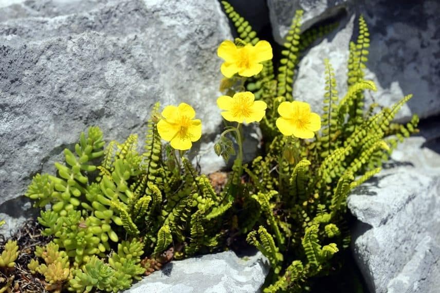 L’hélianthème fait partie des vivaces que l’on croise au détour d’un chemin dans les garrigues. Nul doute qu’elle fera merveille pour agrémenter une rocaille sèche dans un jardin. Le plus difficile ne sera pas sa plantation, mais de choisir votre préférée parmi toutes les variétés de fleur du soleil ! Vous pouvez, par exemple, choisir un hélianthème à fleurs roses, comme le cultivar ‘Ben Hope’, ou à fleur orangée pour la variété ‘Orange Double’. Quant à l’Helienthemum ‘Wisley Primrose’, il se distingue par ses feuilles dans des tons vert argenté et ses délicates fleurs jaune citron. Vous pouvez le marier avec d’autres plantes de rocaille comme une Lavande, un Delosperma, une Armeria, un Erigeron Karvinskianus, une Euphorbe, de jolis Sedums, un Stipa, un Iberis sempervirens, et pourquoi pas un Agave en climat méditerranéen.