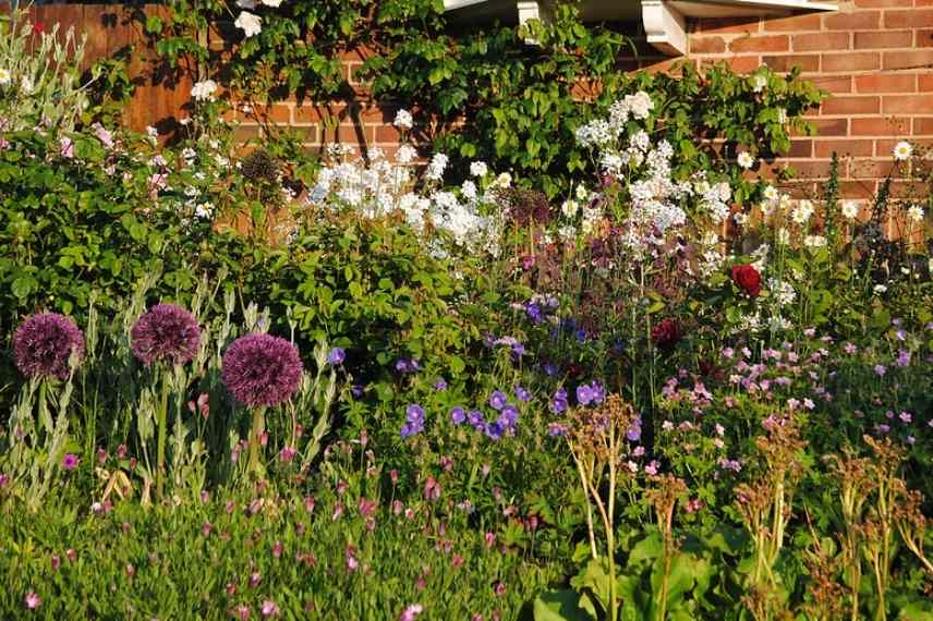 La Julienne des dames (en bas à gauche) s’associe avec toutes sortes de plantes vivaces et arbustes dans un mixed border : Aconitums napellus, Deutzia gracilis, Pivoines, Alliums christophii, Carex testacea ‘Lime Shine’ et eupatoires