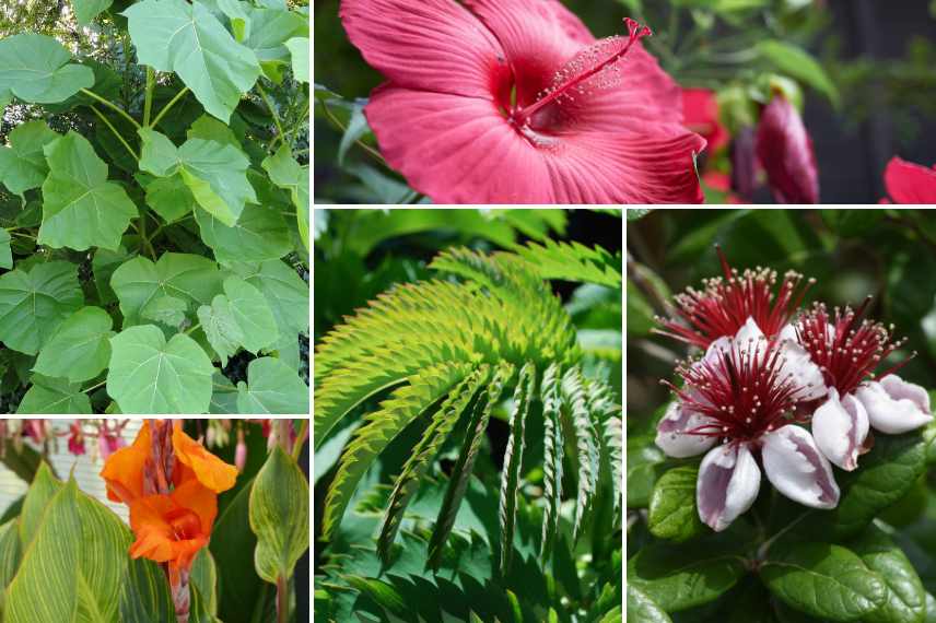 Nous voici donc en présence d’une plante généreuse qui poussera à 2 m de haut environ, et se mêlera avantageusement dans un massif à une grande gamme de floraisons chatoyantes dans les tons rose à rouge, sans oublier l’orange : Hibiscus des marais (comme l’Hibiscus moscheutos ‘Red’), cannas, Alstroemerias, Hedychiums, etc. Des arbustes à beau et ample feuillage comme le Melianthus major, les bananiers, les Tetrapanax rajouteront au côté évasion ! Ici, nous avons aussi convié un goyavier du Brésil (Feijoa sellowiana) pour l’exotisme radieux de sa floraison printanière. Pour ce genre de scène, plantez plutôt serré et accentuez l’aspect tropical avec quantité de végétaux.