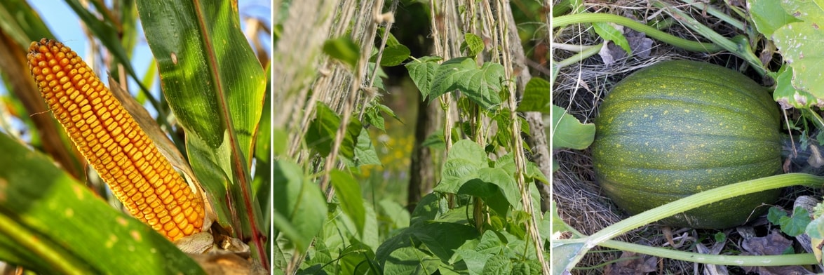 - maïs, haricots grimpants et courges (les pieds de maïs servent de tuteurs aux haricots qui, eux, apportent de l’azote aux courges)