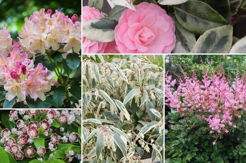Grâce à son feuillage persistant, le leucothoe habillera une lisière de sous-bois, même en hiver lorsque les arbres seront nus. Dans ce milieu boiser, on n’aura que l’embarras du choix parmi les variétés de Leucothoe. À noter que le cultivar ‘Whitewater’ apportera de la luminosité grâce à son beau feuillage panaché vert et crème, prenant des teintes cuivrées dès que le froid apparait. On pourra le marier à d’autres arbustes persistants, par exemple un Camellia, un Rhododendron ‘Percy Wiseman’ et un Kalmia latifolia ‘Tad’. Pour apporter de la légèreté, on installera des vivaces à la floraison vaporeuse, comme celle de l’Astilbe, la Brunnera, et des Fleurs des Elfes (epimediums). Pour un sous-bois presque toujours fleuri, plantez également des Astrances, Bergenias, Liriopes, Primevères et des Anémones Japonaises. Afin de créer une lisière de sous bois luxuriante, on ajoutera des fougères, des Hostas et quelques Heuchères pour leurs feuillages colorés.