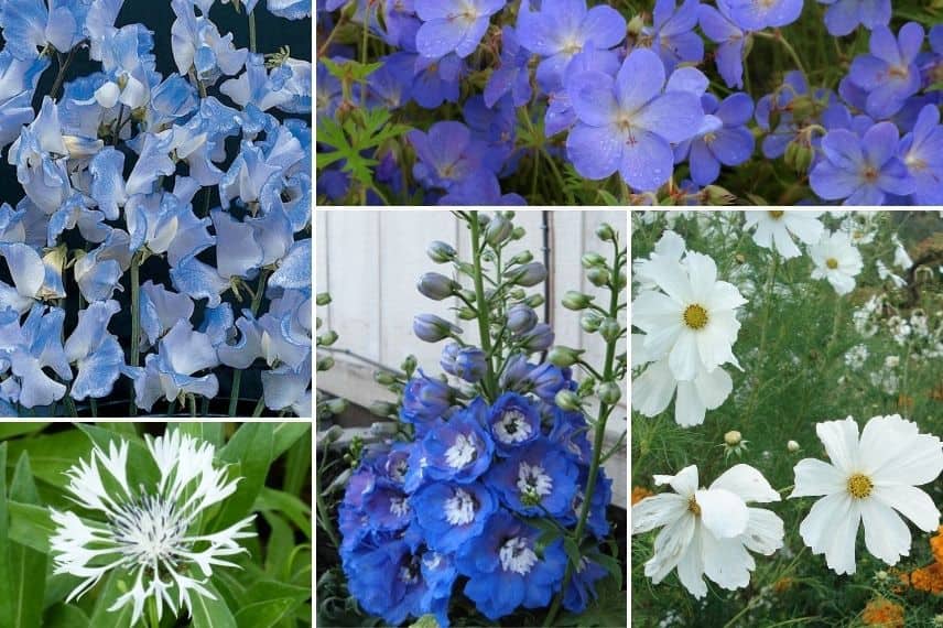 Au jardin, les fleurs bleues et blanches composent une ambiance pleine de douceur et de fraicheur. Les pois de senteurs Lathyrus ‘Blue Ripple’ et ‘White Ensign’ trouveront naturellement leurs places dans ce décor apaisant, enlacés l’un à l’autre sur un support en bambou ou un treillage. On plantera à proximité d’autres hautes vivaces à la floraison bleue ou blanche, comme les Delphiniums, les Roses trémières ‘Chater’s Double Blanc’, un Lupin ‘Le Gentilhomme’ et une Digitale ‘Alba’. Au premier plan, on pourra créer un beau massif composé d’une Pivoine ‘Immaculée’, d’Agastache ‘Blue Boa’, de Bleuet, d’œillet et un Géranium vivace ‘Johnson’s blue’. Semez également quelques annuelles, par exemple des Nigelles de Damas ‘Miss Jekyll Blue’, des Cosmos ‘Sensation Purity’ et des Mufliers ‘Royal Bride’ dont les fleurs papilionacées rappelleront celles des pois de senteur. Pour ajouter une touche d’originalité, vous pouvez installer un Pavot ‘Bleu de l’Himalaya’ ou le Pavot ‘Royal Wedding’, deux variétés encore rares au jardin, mais splendides.