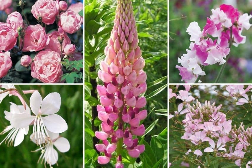 Rosier ‘Raubritter’, gaura, lupin ‘La Chatelaine rose’, pois de senteur ‘route 66’ et Cléome Senorita ‘Carolina’