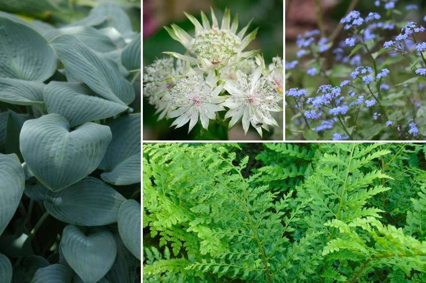 Un exemple d’association à l’ombre : Hosta tardiana ‘Halcyon’, Astrantia major ‘White Giant’, Brunnera macrophylla ‘Jack Frost’ et Polystichum setiferum ‘Proliferum’