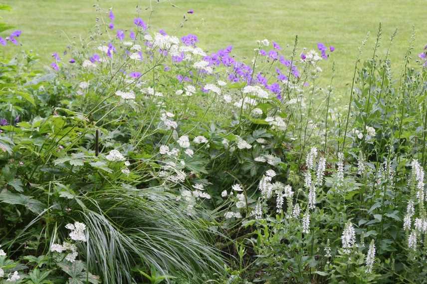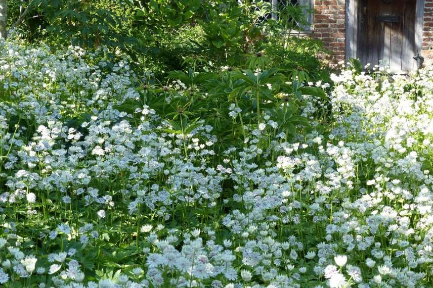 Les variétés blanches à reflets grisés, comme l’astrantia major Alba ou Buckland, complètent élégamment un jardin blanc, et s’associent parfaitement aux teintes presque métalliques des hostas ou des saules à feuillage gris.