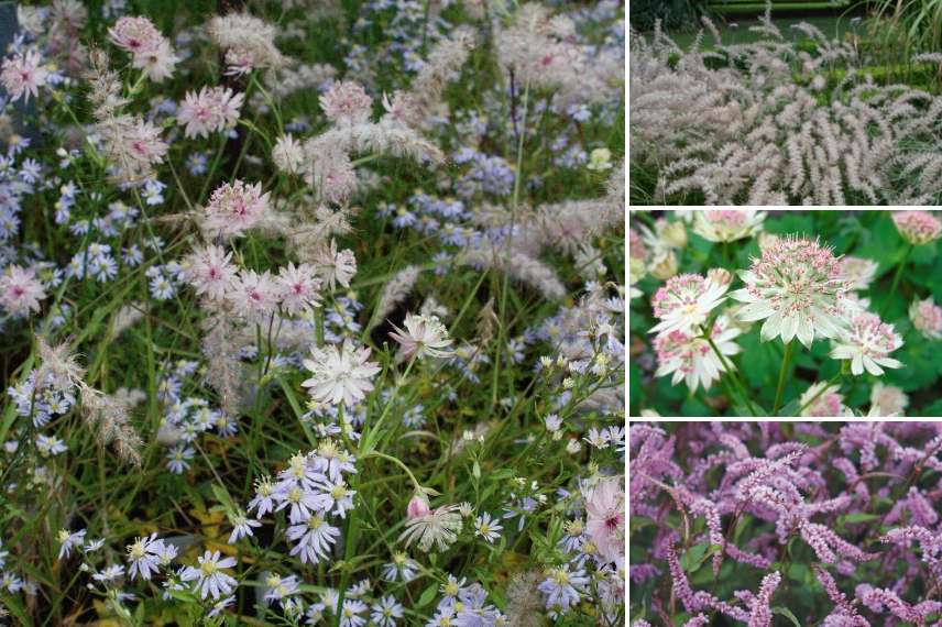 Un exemple d’association naturaliste : Astrantia major ‘Buckland’, Pennisetum orientale, Aster cordifolius ‘Photograph’ et Persicaria amplexicaulis ‘Pink Elephant’