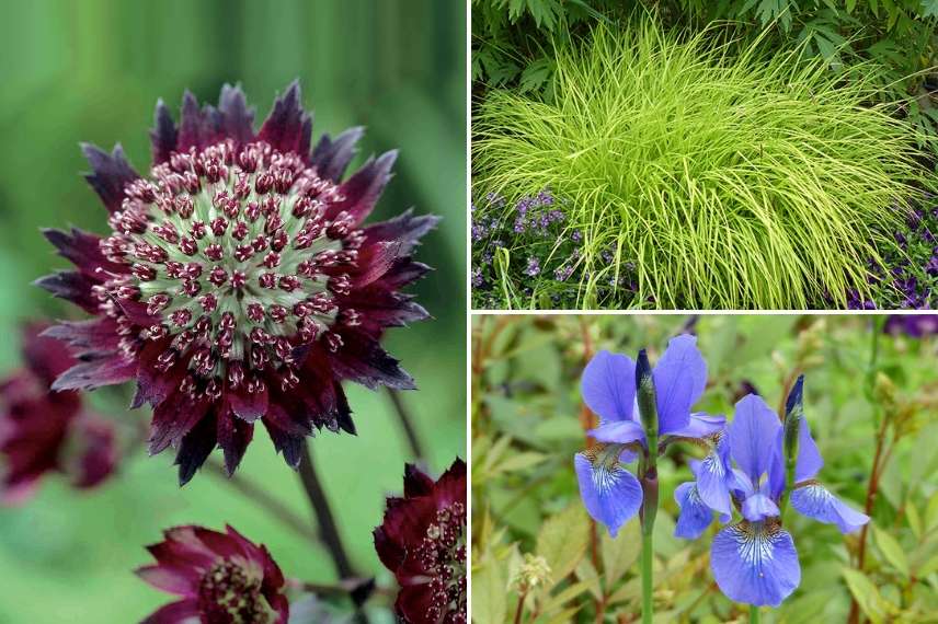 Un exemple d’association contrastée : Astrantia major ‘Moulin Rouge’, Carex elata ‘Aurea’ et Iris sibirica ‘Ceasar’s Brother’