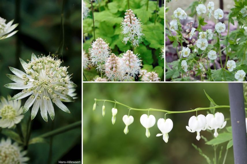 Une idée d’association pour un jardin blanc à l’ombre : Astrantia major ‘Alba’, Tiarella cordifolia ‘Moorgrun’, Geranium phaeum ‘Album’, Dicentra spectabilis ‘Alba’ et ajoutez quelques touches de Dicentra formosa ‘Aurora’ au superbe feuillage graphique vert poudré de gris