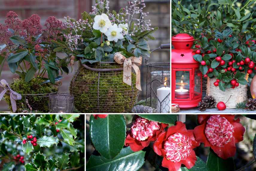 Daphne odora, Skimmia japonica en boutons et Hellébore oriental.