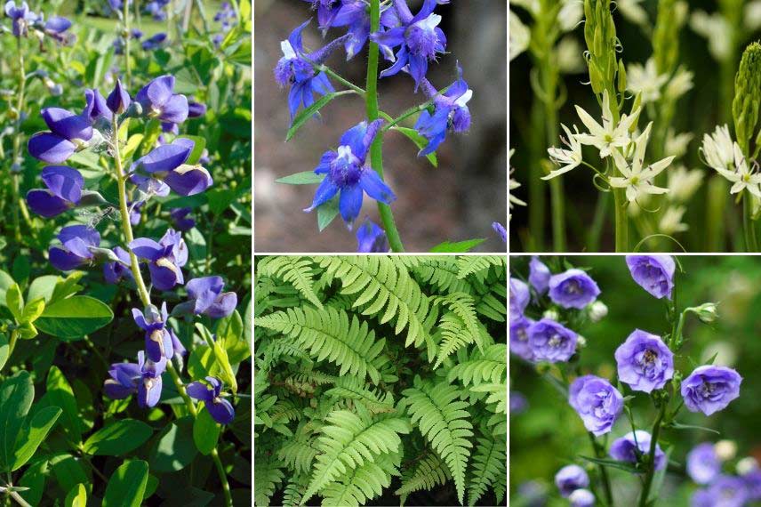 Avec leur feuillage léger et généreux, les baptisias s’intègreront facilement dans un jardin de cottage. Choisissez de préférence une variété aux teintes douces, comme le Baptisia ‘Purple Smoke’, qui offre une floraison très aérée, aux teintes bleu violet, d’une couleur à la fois douce et profonde. Pour l’accompagner, nous vous conseillons de privilégier les plantes à fleurs bleu, mauve, ou blanc, ce qui vous donnera un effet très harmonieux. Les jardins de cottage créent un sentiment d’opulence végétale en associant des plantes aux feuillages généreux et une multitude de fleurs aux teintes douces. Avec sa délicate floraison en clochettes, la campanule persicifolia s’intégrera à merveille dans ce type de jardin ! Vous pouvez l’accompagner de fleurs de delphiniums, centaurées, lupins… Le Baptisia se marie également très bien avec les élégantes fleurs blanches des camassias. Nous vous conseillons notamment la variété Camassia leichtlinii ‘Alba Semiplena’, à fleurs doubles. Enfin, les plantes grimpantes, comme les clématites, trouveront elles aussi leur place dans ce type de jardin.