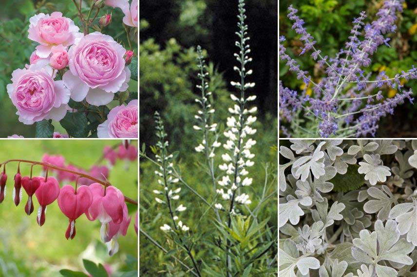Comme les Baptisia offrent une floraison délicate et un feuillage très léger, ils peuvent entrer dans la composition d’une belle scène romantique. Privilégiez les variétés à fleurs blanches ou très douces, comme le Baptisia australis ‘Alba’, ou le baptisia ‘Pink Truffles’, à fleurs rose tendre. Vous pouvez installer dans le fond du massif quelques arbustes, hortensias, spirées, et évidemment des rosiers ! Plantez devant eux des digitales, penstemons, cœur-de-Marie, géraniums vivaces, Phlox subulata… Profitez de la floraison blanche très vaporeuse des gypsophiles ! Elles produisent entre juin et août une multitude de petites fleurs blanches. Découvrez aussi le superbe Phlomis tuberosa ‘Amazone’, qui offre des tiges florales dressées portant des verticilles de fleurs mauves, d’une teinte très douce. L’idéal serait également d’installer une petite tonnelle ou un treillage, sur lequel vous pourrez conduire des rosiers grimpants ou des clématites.