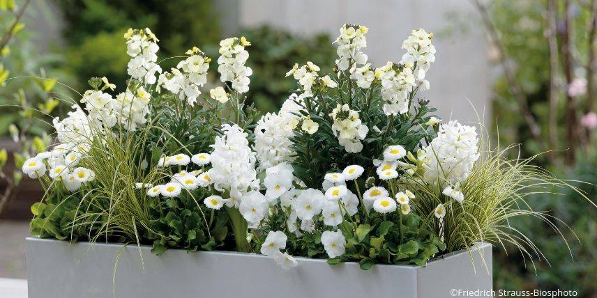 Les petites pensées, les primevères à fleurs très doubles, les giroflées et les pâquerettes en pompons sont parfaites pour réaliser de jolies compositions fleuries, à installer sur le rebord d’une fenêtre ou sur une table dans le jardin. Elles se déclinent en plusieurs coloris et sont faciles à associer que ce soit dans des tons pastels ou plus vifs. Pour changer un peu, optez pour un décor monochrome frais et élégant. Pour cela, garnissez votre jardinière de giroflées, de pensées, de pâquerettes, de jacinthes… dans des tons blancs et allégez le tout avec quelques touffes de graminées comme le fabuleux Carex ‘Ice Dance’. Vous pourriez remplacer les pâquerettes par des Marguerites du Maroc, substituer les graminées par du Cinéraire argenté… tout est possible !