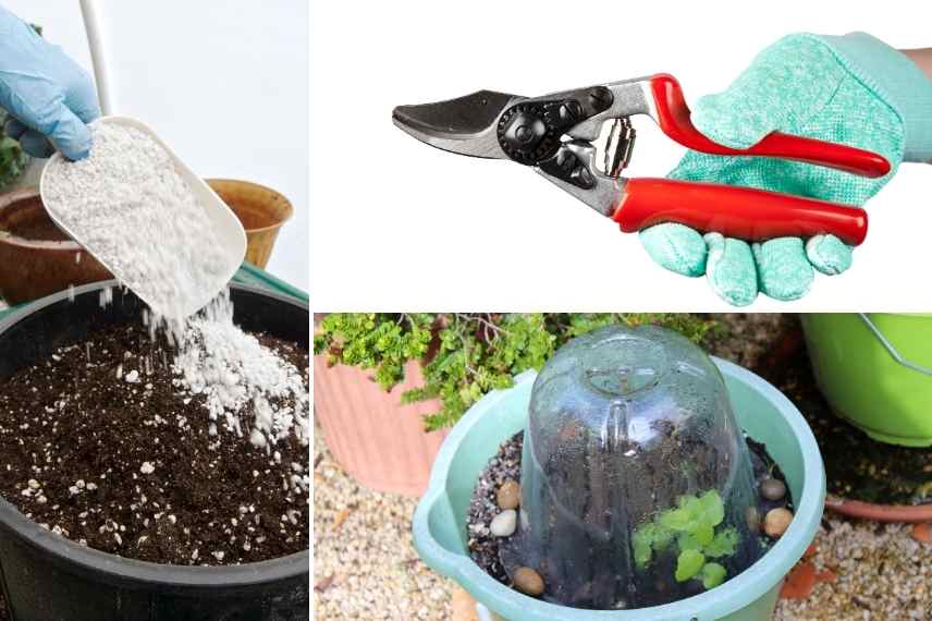 Sécateur, substrat bien drainant (ici avec de la perlite) et petite cloche ou bouteille : vous avez tout en main pour réussir vos bouturages !