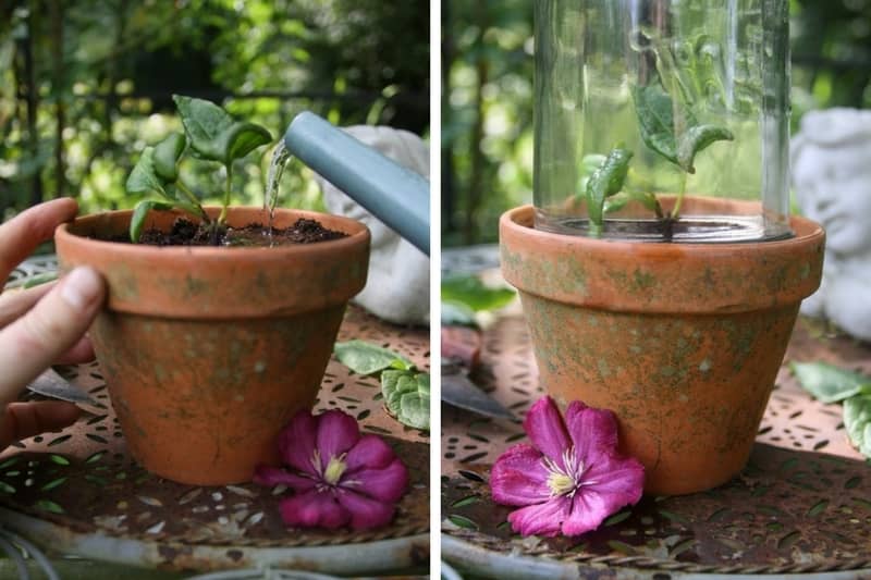 - Arrosez et recouvrez le pot avec un sachet plastique transparent, une cloche ou une bouteille en plastique coupée, afin de conserver une atmosphère humide.