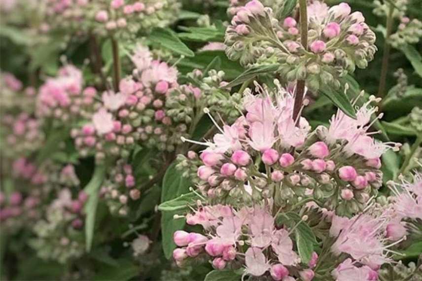 Le Caryopteris clandonensis ‘Stephi’ est l’une des meilleures variétés de spirée à fleurs rose. Plutôt précoce, cet arbuste fleurit dès la fin juillet jusqu’à octobre, en nous offrant des bouquets de couleur rose lilas pâle délicatement parfumé. Son feuillage caduc vert argenté dégage également un subtil parfum au froissement. À maturité, il forme un buisson touffu, légèrement évasé de 75 cm en tout sens. Relativement rustique, ce caryopteris est facile à cultiver en plein soleil, dans un sol drainé, léger, caillouteux, sableux et même calcaire. Il trouvera naturellement sa place dans un bac, un massif ou une haie basse en compagnie de Perovskia, de népéta, de lavande, de sauge arbustive, d’Aster et d’un rosier arbustif.
