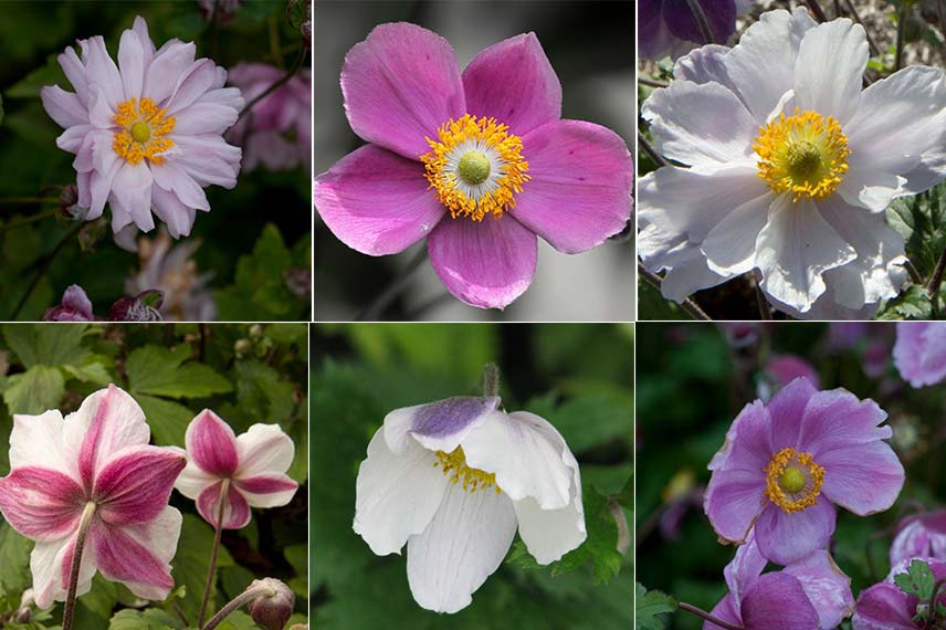 Choix de forme avec l’anémone ‘Little Princess’, ‘Seranade’, ‘Princesse Charlotte (en haut, de gauche à droite) et anémone ‘Honorine Jobert’, ‘Snow Angels’, ‘Tiki Sensation’ (en bas, de gauche à droite)