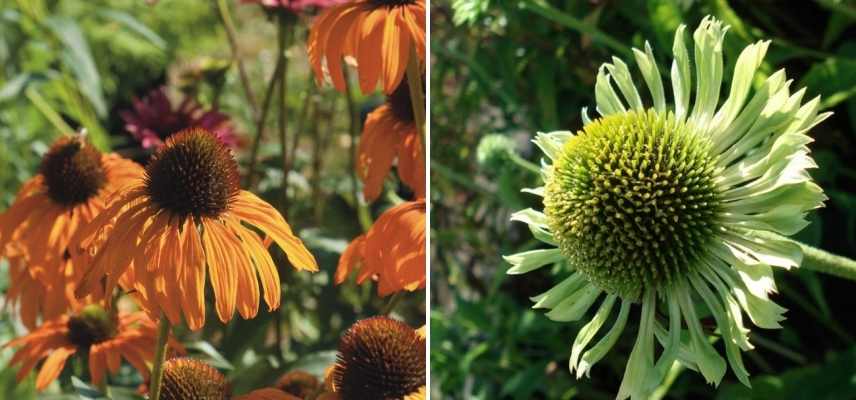 On a parfois tendance à confondre les échinacées avec les rudbeckias alors qu’elles sont d’un genre différent, et surtout que la couleur de leurs fleurs était à l’origine plutôt distinct : roses et orangés pour les échinacées, blanches et jaunes pour les rudbeckias. Ceci n’est plus tout à fait vrai avec l’introduction de nombreux cultivars développés à partir de l’échinacée pourpre, qui a vu leur palette de couleurs s’étendre considérablement, du blanc, au jaune, aux roses et rouges, en passant par le vert, en plus de certaines variétés bicolores. Les échinacées sont notamment intéressantes par leurs coloris qui offrent des variations de couleurs en avançant dans leur épanouissement : orange tirant vers le pourpre, rose s’intensifiant, jaune virant au blanc chez ‘Meringue’ par exemple.