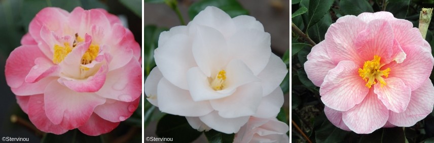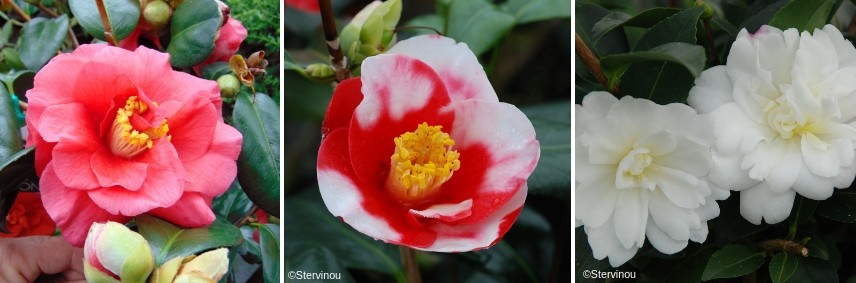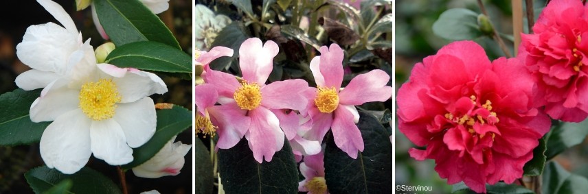 Camélias ‘Yuletide’, ‘Sunny Side’ et ‘Versicolor’