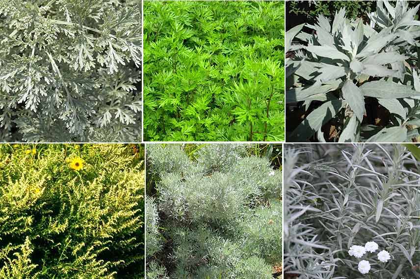 Artemisia ‘Powis Castle’, Artemisia vulgaris, Artemisia ludoviciana ‘Valerie Finnis’, Artemisia vulgaris ‘Oriental Limelight’, Artemisia alba ‘Canescens’ et Artemisia ludoviciana ‘Silver Queen’ (de haut en bas et de gauche à droite)