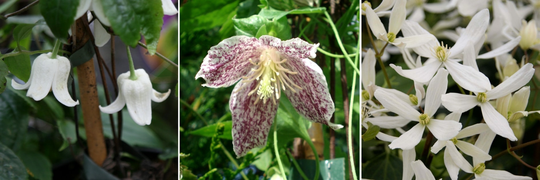 Clematis ‘Winter Beauty’, Clematis cirrhosa ‘Freckles’ et Clematis armandii ‘Snowdrift’