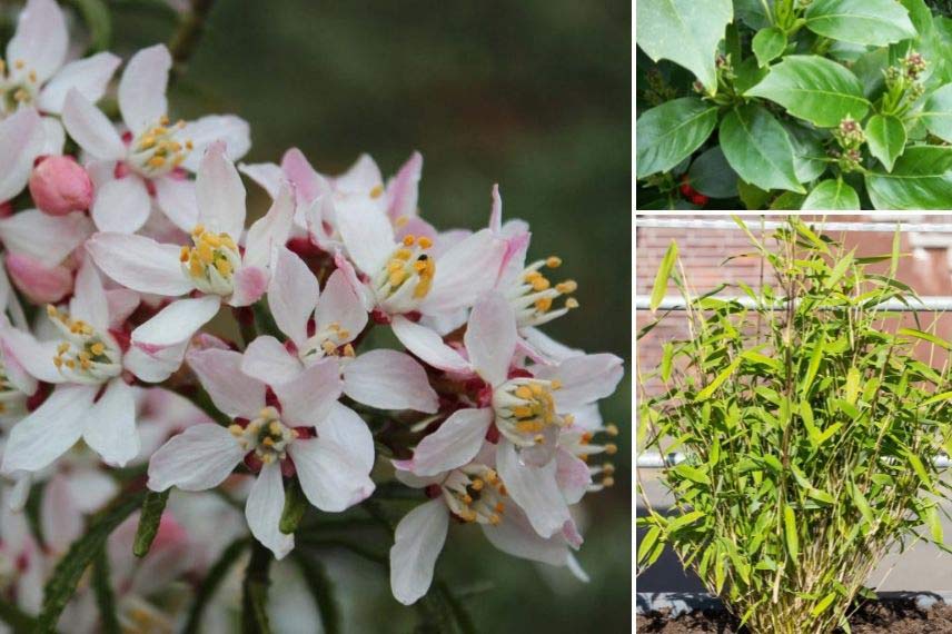 Sur une petite terrasse peu utilisée en hiver, choisissez des végétaux à feuillage caduc, qui laisseront passer la lumière pendant la saison froide. À l’inverse, pour une protection toute l’année, optez par exemple pour l’oranger du Mexique Choisya ternata ‘Apple Blossom’ (1 mètre 20 de hauteur pour 60 cm d’envergure) ou l’Aucuba du Japon ‘Rozannie’ (1 mètre 10 en tout sens), qui conservent leurs feuilles en toutes saisons.