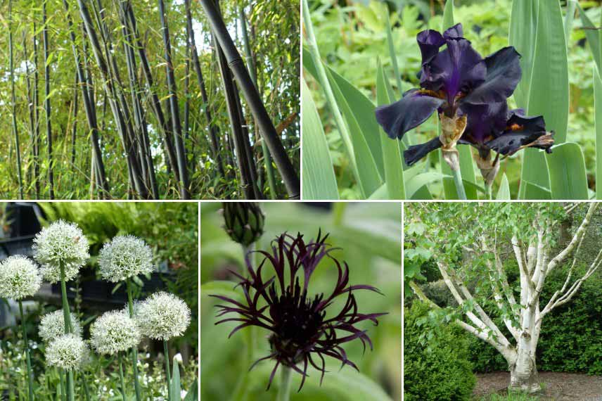Associer des fleurs noires à des floraisons blanches est l’un des contrastes les plus percutants. L’intensité du noir y rencontre la pureté éclatante du blanc, créant une ambiance graphique et contemporaine. Créez un massif en y intégrant l’Iris germanica ‘Old Black Magic’ aux côtés de la centaurée ‘Black Sprite’. Faites ressortir le noir de leur floraison avec les inflorescences sphériques et blanches de l’Allium stipitatum ‘Mount Everest’ et l’écorce blanche du bouleau Betula utilis ‘Jacquemontii’. En font de massif, vous pouvez intégrer des bambous Phyllostachys nigra, dont les cannes sombres feront écho aux fleurs noires. Ce jeu de clair-obscur attire immédiatement l’œil et donne du relief à n’importe quel massif.