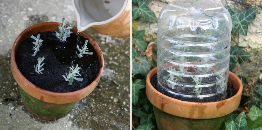 - placez le pot sous un châssis, dans une serre ou encore une véranda, dans un coin ombragé. Si vous n’avez rien de tout cela, le pied d’une haie convient aussi mais pensez alors à poser une cloche (ou une bouteille plastique découpée) pour que les boutures ne se dessèchent pas. On appelle cette technique le bouturage à l’étouffé. Aérez de temps en temps afin que l’air circule et d’éviter ainsi tout risque de moisissures. Vous pouvez aussi enterrer le pot afin que le terreau sèche moins rapidement et que les boutures soient protégées du froid hivernal.