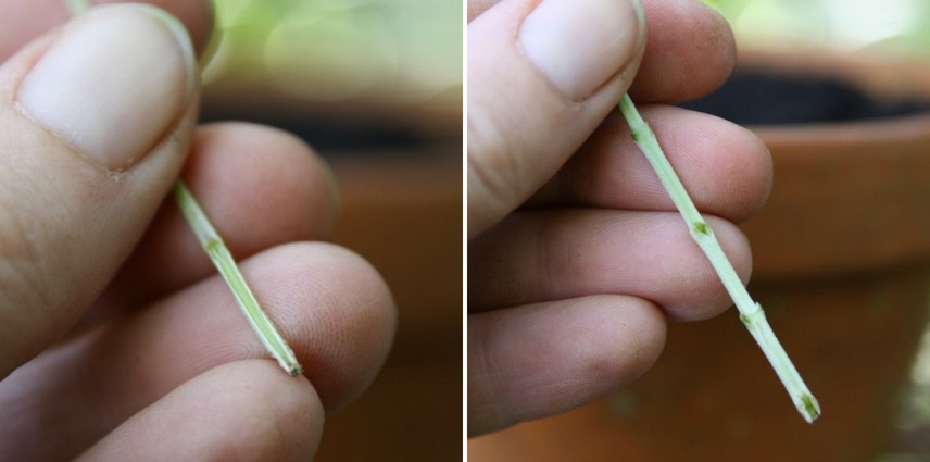- prélevez sur votre “plante-mère” les extrémités de jeunes rameaux encore verts, de 8-10 cm de longueur. Préférez les rameaux n’ayant jamais fleuri. Ils sont de meilleure qualité pour le bouturage et plus enclins à produire des racines. Enfin, coupez juste au-dessous d’un nœud.