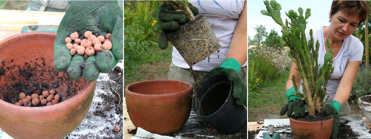 Pour rempoter un cactus, pensez à installer une couche drainante au fond, par exemple avec des billes d’argile. Sortez délicatement le cactus de son ancien pot, en utilisant des gants ou du papier journal, puis plantez dans un pot légèrement plus grand, avec un substrat drainant