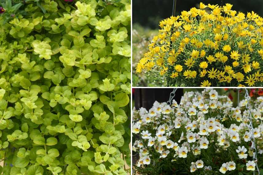 Osteospermum ‘Voltage Yellow’, Nemesia ‘Sunsatia Plus Little Vanilla’ et Lysimachia nummularia ‘Aurea’