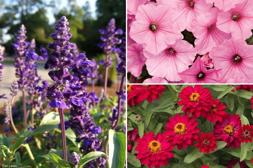 Cultivée en annuelle, la sauge farineuse ‘Victoria’ porte de grands épis bleu-violet profond. Elle résiste bien à la sécheresse et à la chaleur. Arrosez régulièrement mais sans excès, avec un engrais liquide une à deux fois par semaine pour contenter cette petite gourmande. Enfin, ce zinnia est une variété exceptionnelle : floribondité, vigueur, résistance aux maladies, toujours pimpante ! Sa couleur cerise intense est un véritable remède à la morosité. Les zinnias sont de culture facile, prenez soin d’enlever les fleurs fanées afin que la plante ne s’épuise pas à produire des graines.