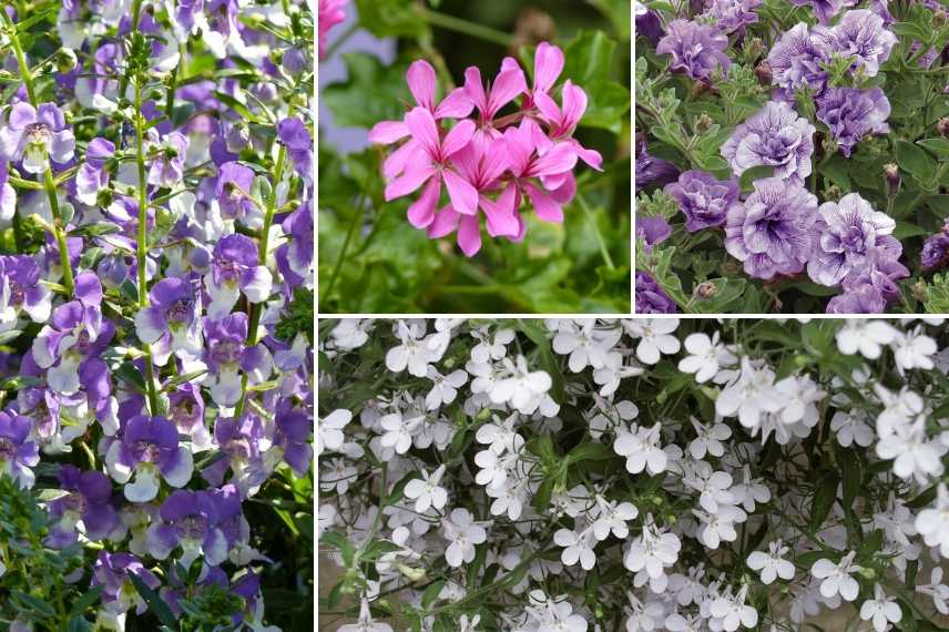 Angelonia ‘Wedgewood Blue’, Geranium lierre Roi des Balcons rose lilas, Petunia Tumbelina Priscilla double lavande veiné, Lobelia ‘Snow White’