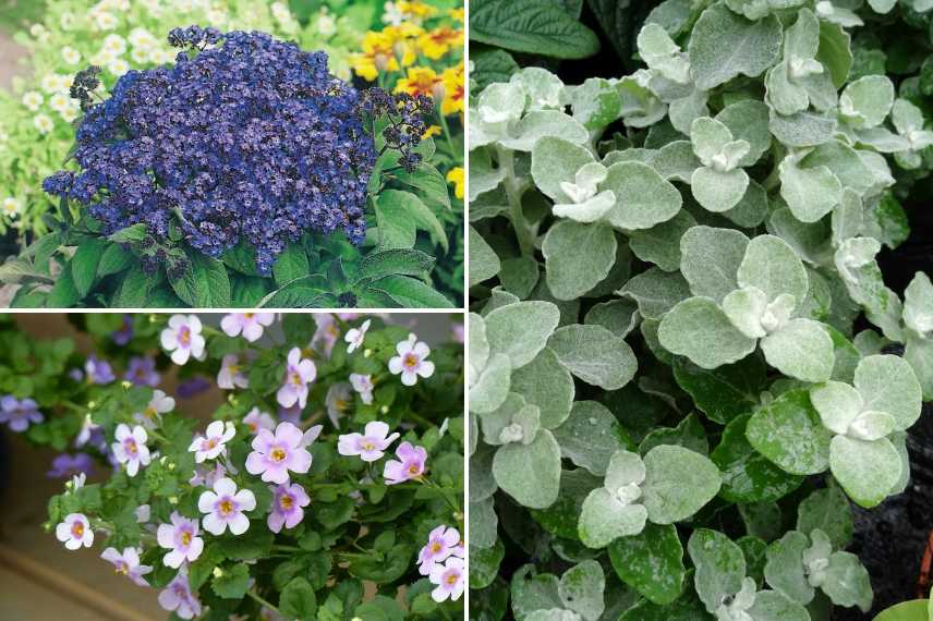 Pour cette potée, l’idée de base est d’associer le bleu violet et l’argent. L’Héliotrope du Pérou se prête bien à la culture en pot. Cette variété naine produit une myriade de petites fleurs améthyste au délicieux parfum de vanille. Il est merveilleusement mis en valeur par les petites feuilles argentées de l’Helichrysum. Ce dernier pourra s’échapper de la potée apportant une petite touche d’élégance incomparable. Enfin, un Bacopa apporte sa teinte tendre et lumineuse.