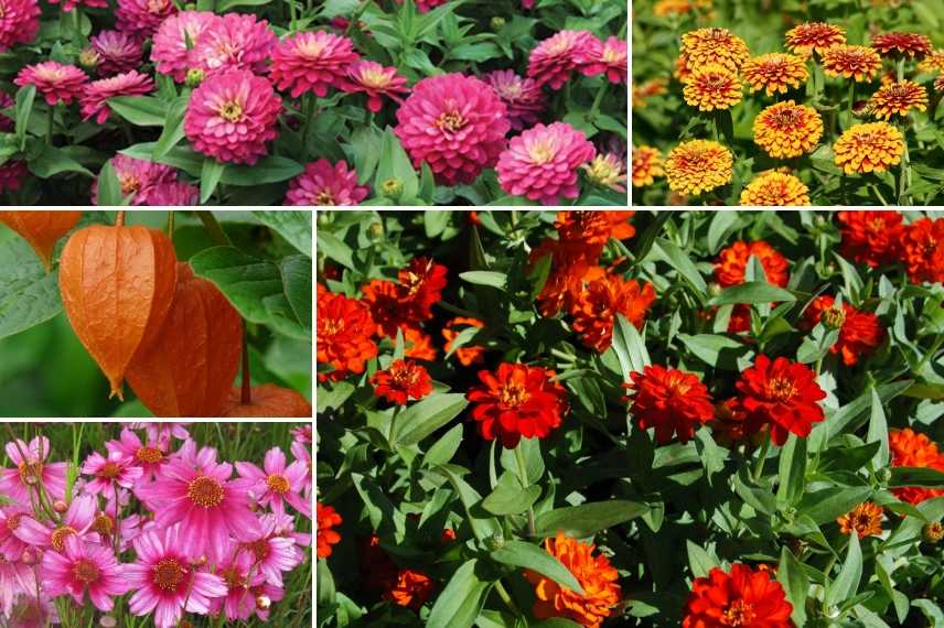 Zinnia ‘Double Zahara Strawberry’, Zinnia ‘Profusion Double Fire’, Zinnia elegans ‘Macarenia’, Coreopsis rosea ‘Heaven’s Gate’ et Physalis