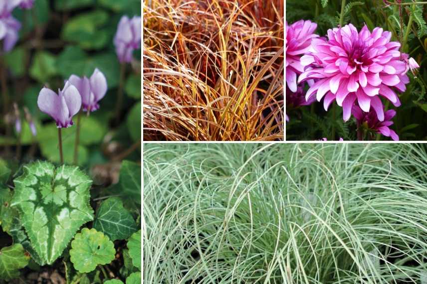 Cyclamen hederifolium, Uncinia rubra, Dahlia nain ‘Gallery Art Nouveau’ et Carex comans ‘Frosted Curls’