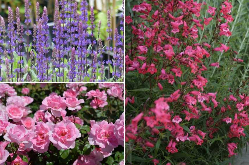 Prenez une grande jardinière, installez votre rosier et entourez-le de 2 ou 3 touffes de sauges aux épis d’un superbe violet intense comme la fabuleuse ‘Caradonna’. Enfin, ajoutez un penstemon couleur cerise à l’harmonieuse silhouette buissonnante et vous aurez une belle composition pour colorer votre terrasse ensoleillée durant de juin jusqu’aux gelées !
